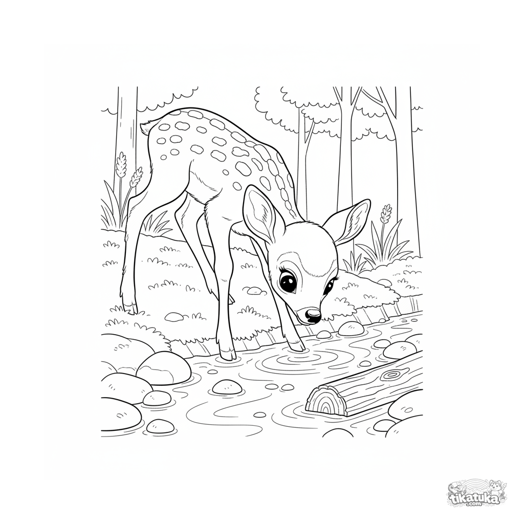 Página para colorear para niños de 7 a 9 años: un cervatillo curioso bebe en la orilla musgosa de un arroyo forestal, con guijarros y un tronco caído.