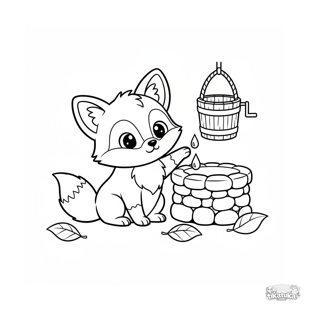 Página para colorear simple para los más pequeños 2-3: un lindo cachorro de zorro investiga el pozo. Grandes áreas abiertas para colorear, personaje amigable.