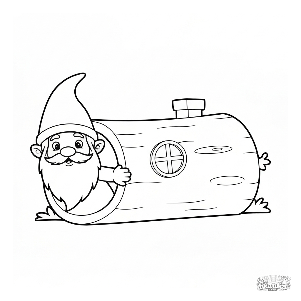 Página para colorear para niños pequeños: un gnomo curioso asomándose por la puerta redonda de su casa en un tronco hueco. Escena simple y tierna para 2-4 años.