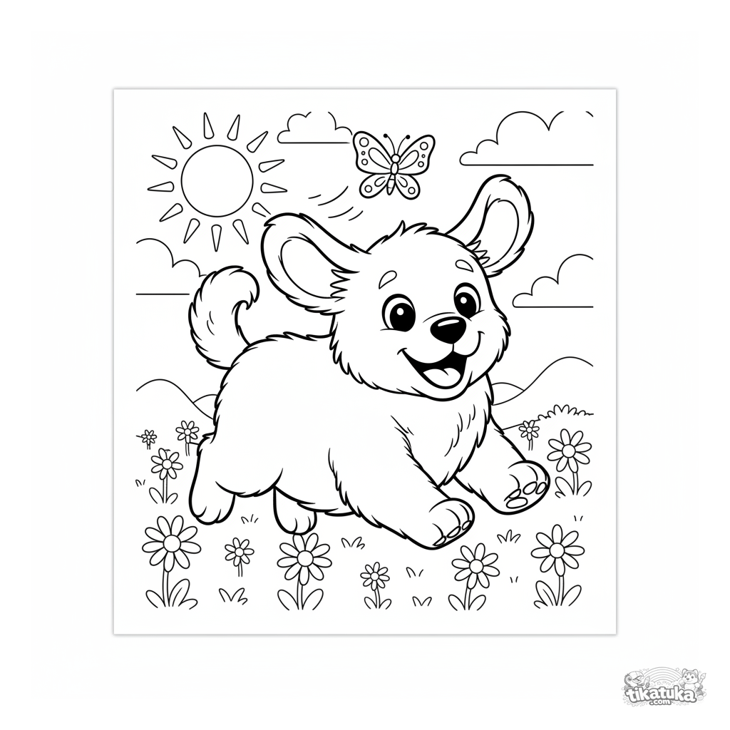 Página para colorear para niños de 4-6 años: un cachorro de golden retriever curioso persigue felizmente una mariposa en un prado soleado. Formas simples y expresión facial linda.