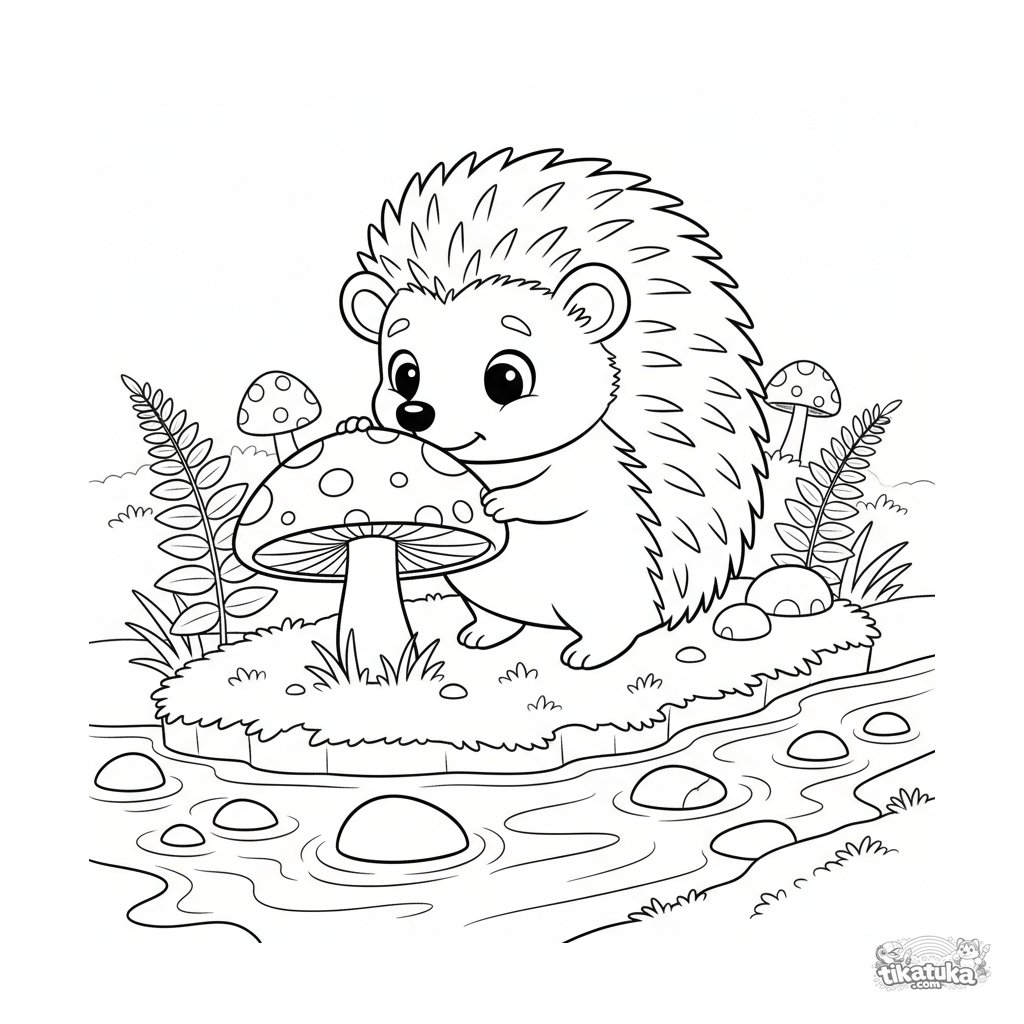 Página para colorear para niños 4-6: un erizo curioso en la orilla de un arroyo claro investiga una seta grande. Una linda escena de naturaleza otoñal con helechos y guijarros.