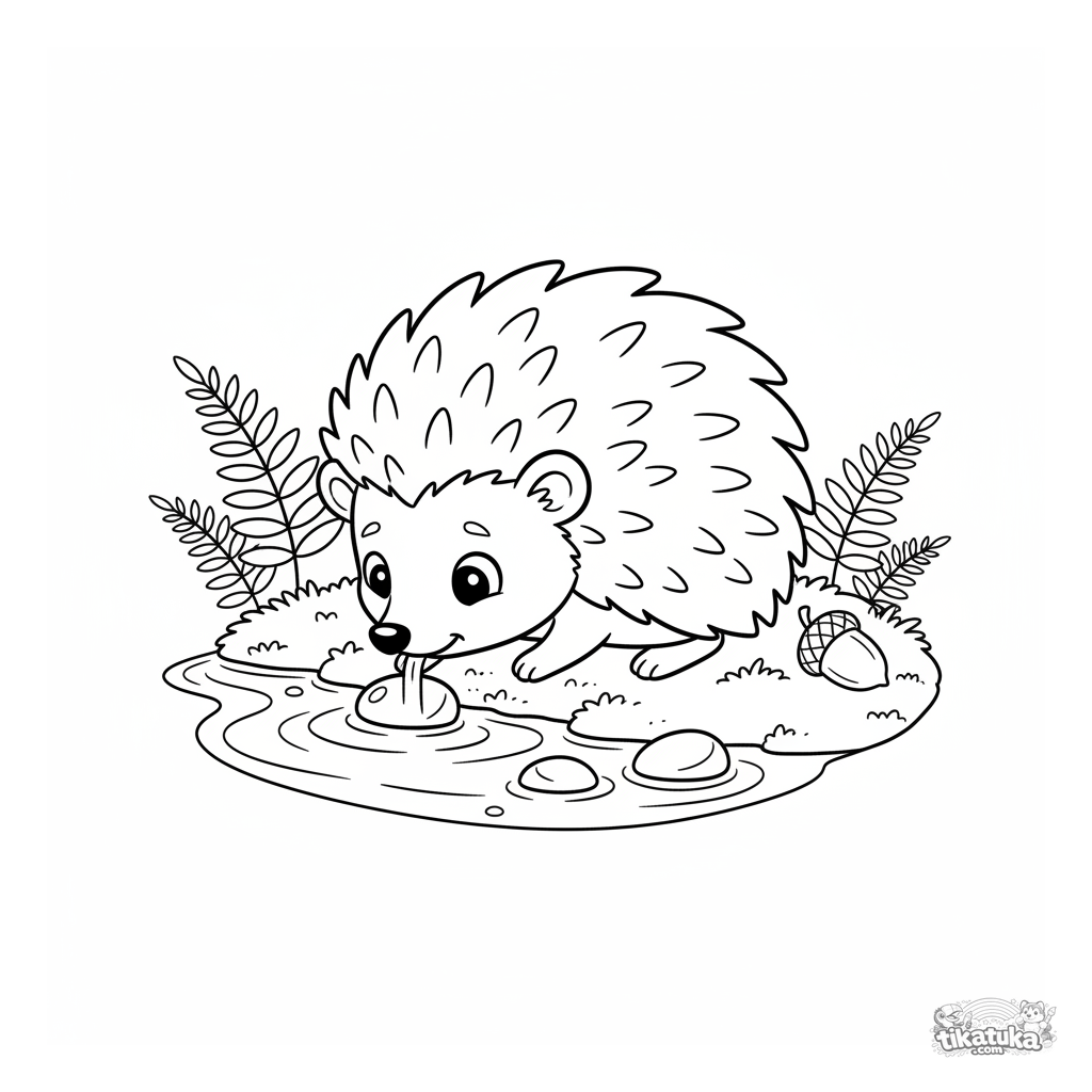Página para colorear para niños 4-6: un lindo erizo bebe agua de un arroyo claro en un banco musgoso. Formas simples, escena clara.