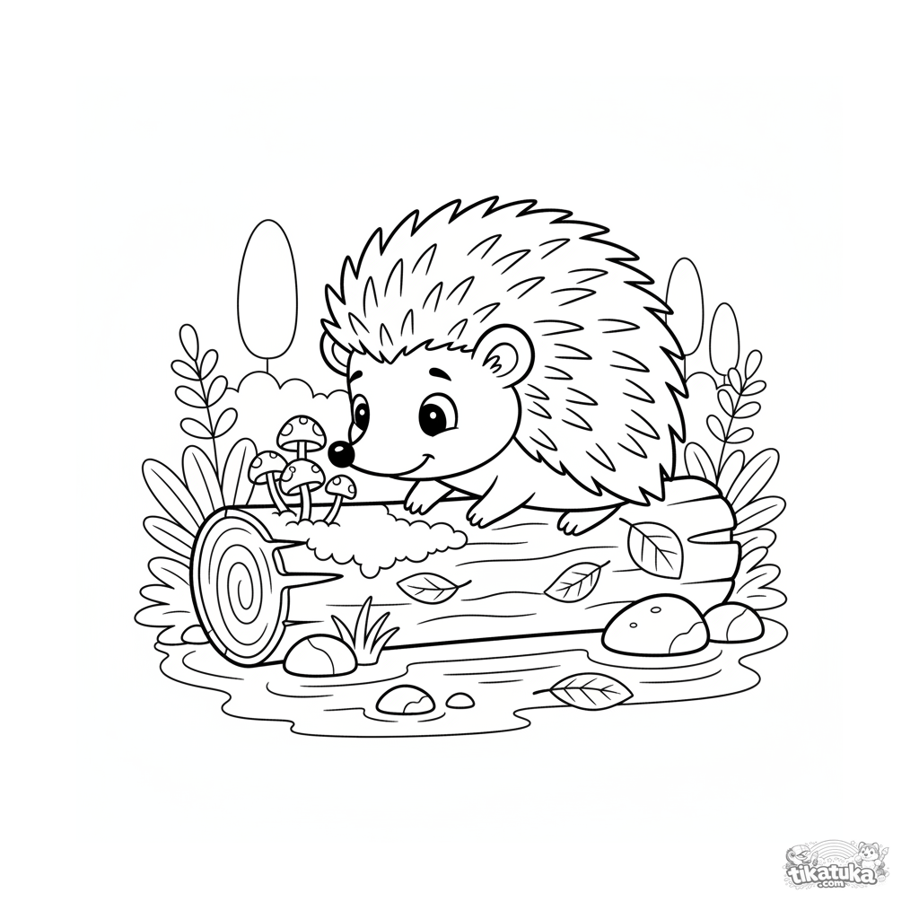 Página para colorear para niños 4-6 años: un erizo curioso investiga setas en la orilla de un arroyo claro. Ilustración suave estilo libro de cuentos.