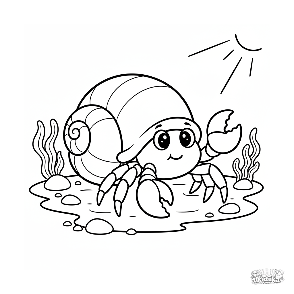 Página para colorear para 4-6 años: un cangrejo ermitaño explora una charca de marea soleada. Ilustración estilo libro de cuentos con formas simples.