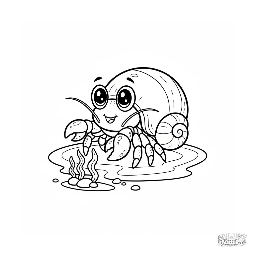 Página para colorear de un lindo cangrejo ermitaño asomándose desde su concha en un charco de marea soleado en aguas poco profundas.