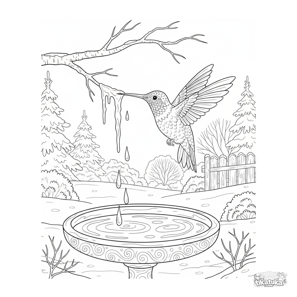 Página detallada para colorear de un colibrí investigando un carámbano en un jardín de invierno. Para niños mayores de 7 a 12 años.