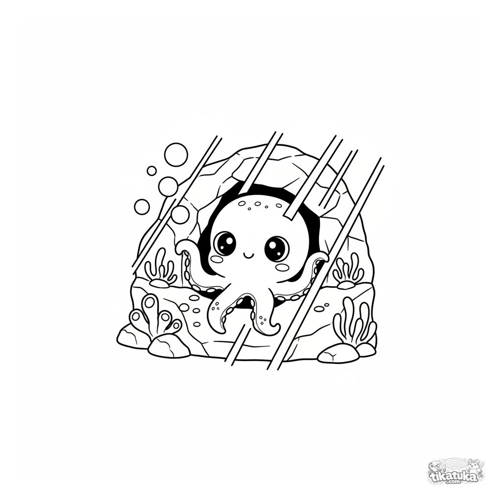 Página simple para colorear para niños pequeños: un pulpo joven con ojos grandes asomándose desde una grieta rocosa iluminada por el sol en aguas poco profundas. Formas muy simples. Para 2-3 años.