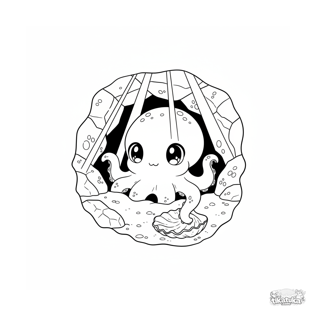 Página para colorear de un pulpo curioso asomándose desde una grieta rocosa en aguas soleadas. Para 4-6 años. Formas simples, contornos claros.
