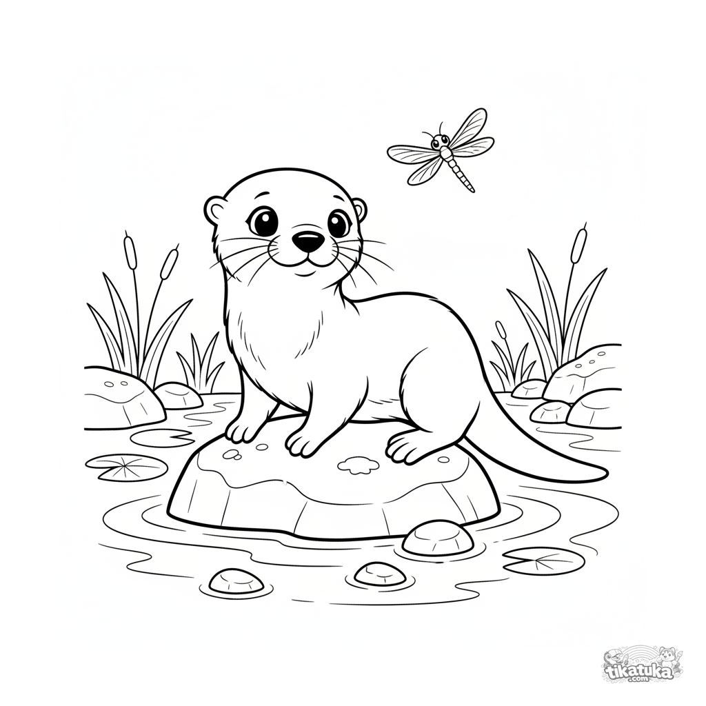 Página para colorear para niños de 4-6 años: un cachorro de nutria curioso se balancea en una roca en un arroyo claro, observando una libélula.