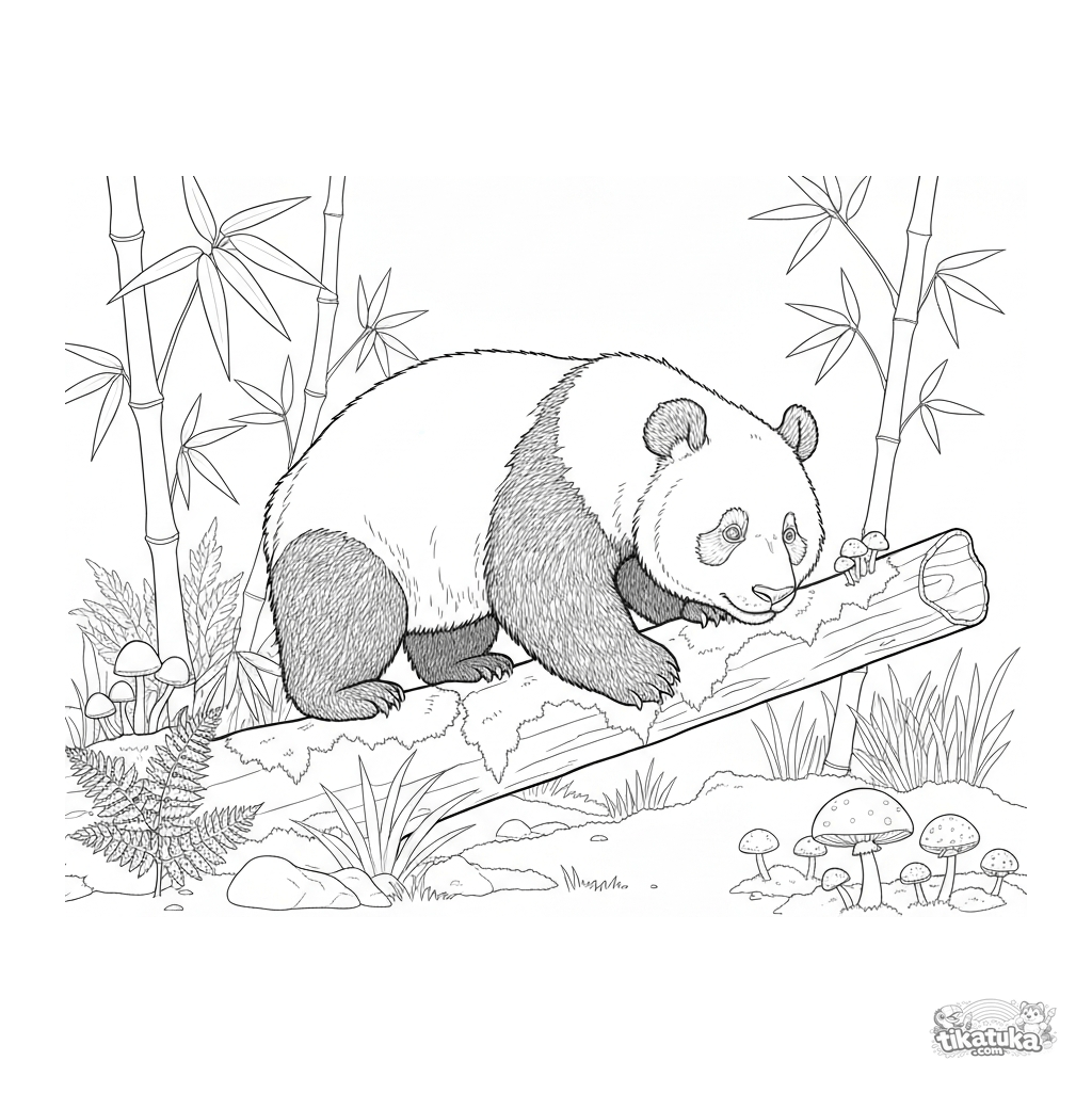 Página para colorear de un panda rojo curioso para niños de 6 a 9 años. Se equilibra en un tronco musgoso en un bosque de bambú, olfatea setas.