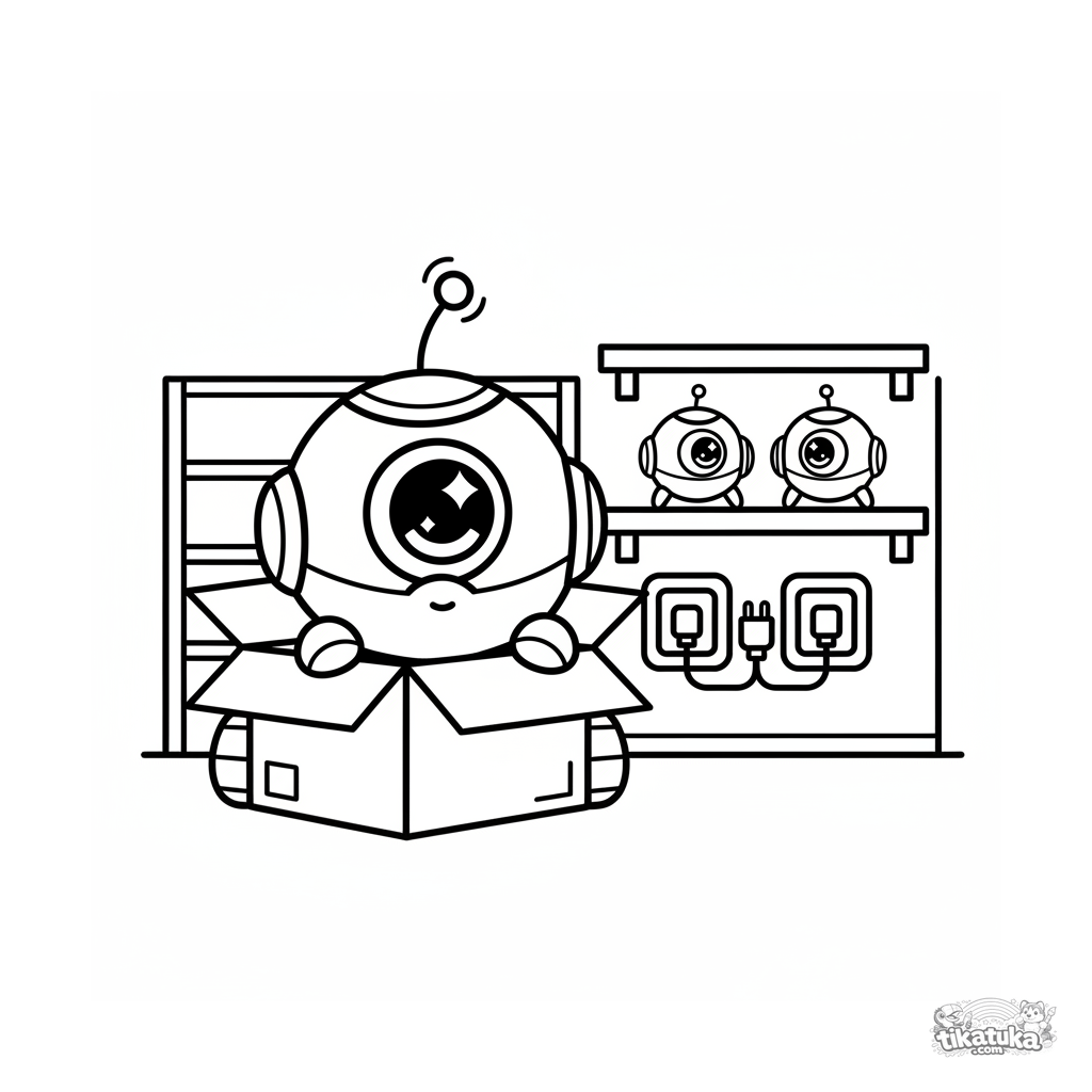 Página para colorear simple para bebés 2-3 años: un robot esférico curioso asoma desde detrás de una caja. Formas grandes, pocos detalles, áreas enormes para colorear.
