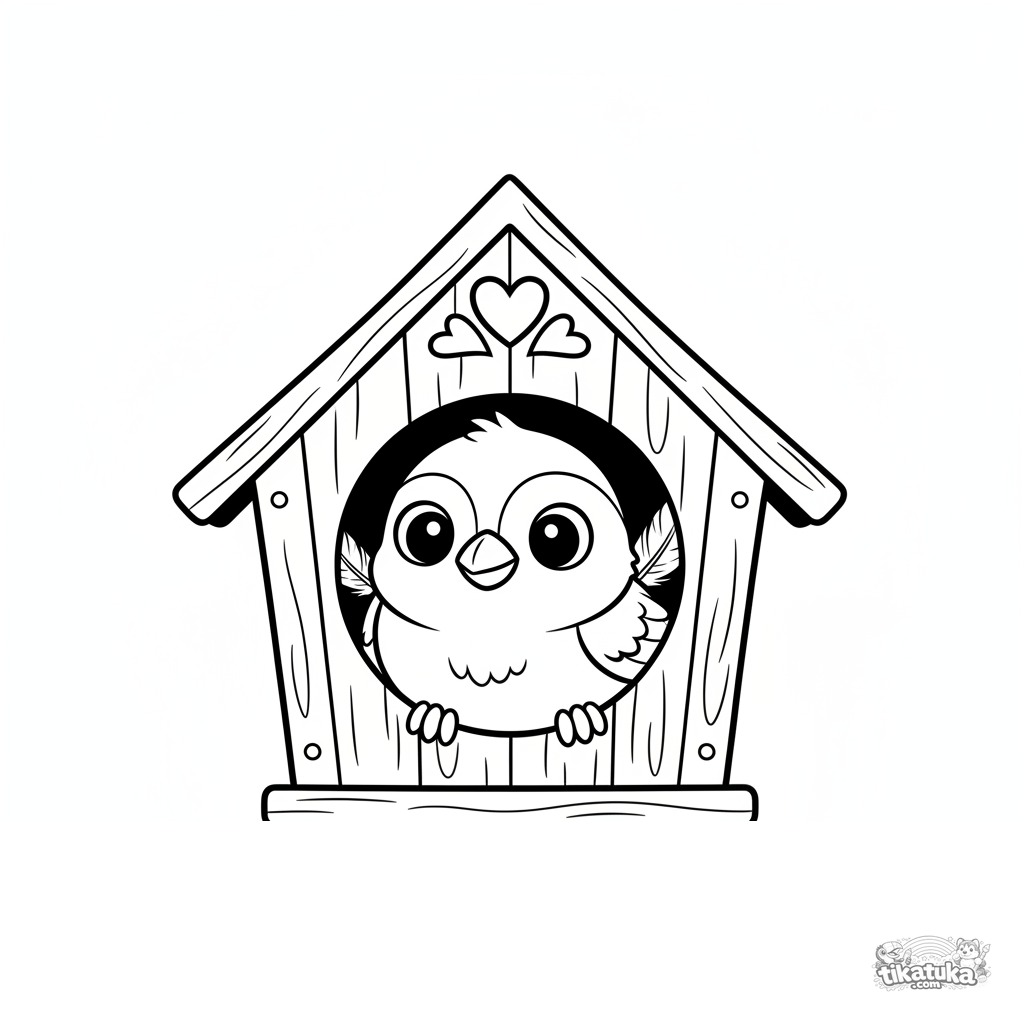 Página para colorear para niños pequeños: un gorrión curioso asoma la cabeza por la ventana redonda de una casa de pájaros de madera.