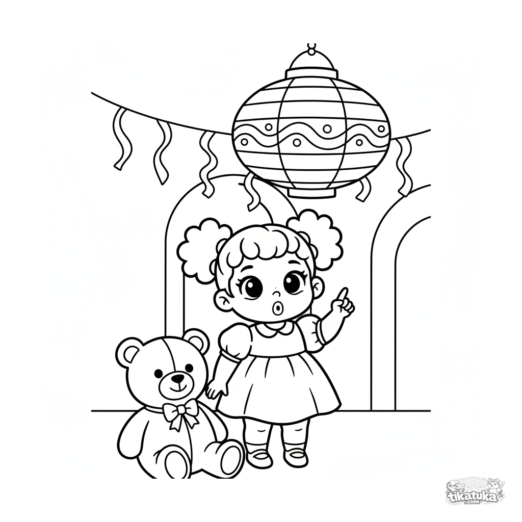 Página para colorear simple para niños pequeños 2-3: una niñita en un salón festivo señala con curiosidad un farolillo de papel colgante. Formas grandes y claras.