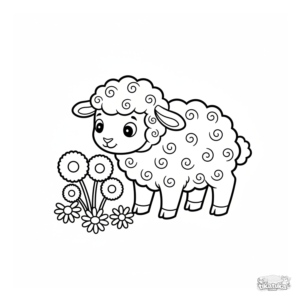 Página para colorear para niños pequeños: un cordero rizado en un prado. Formas grandes y simples con amplios márgenes.