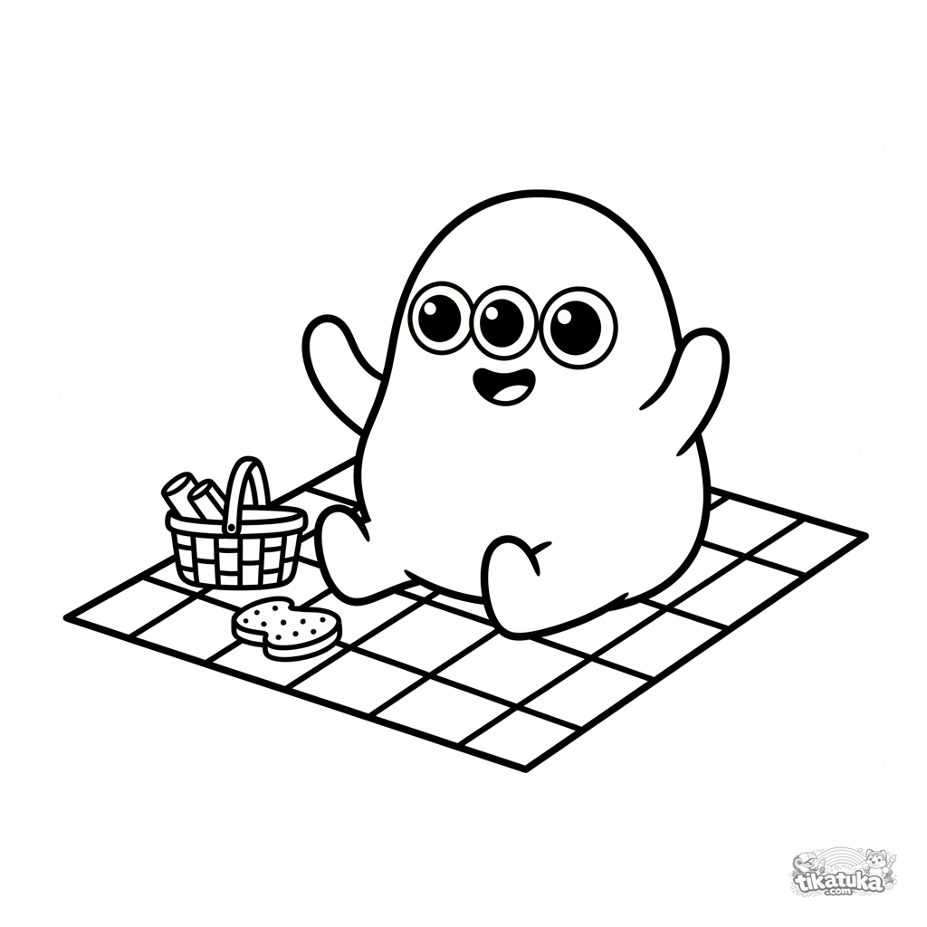 Divertida página para colorear de un microbio ameba amigable teniendo un picnic. Para niños pequeños de 2 a 5 años.