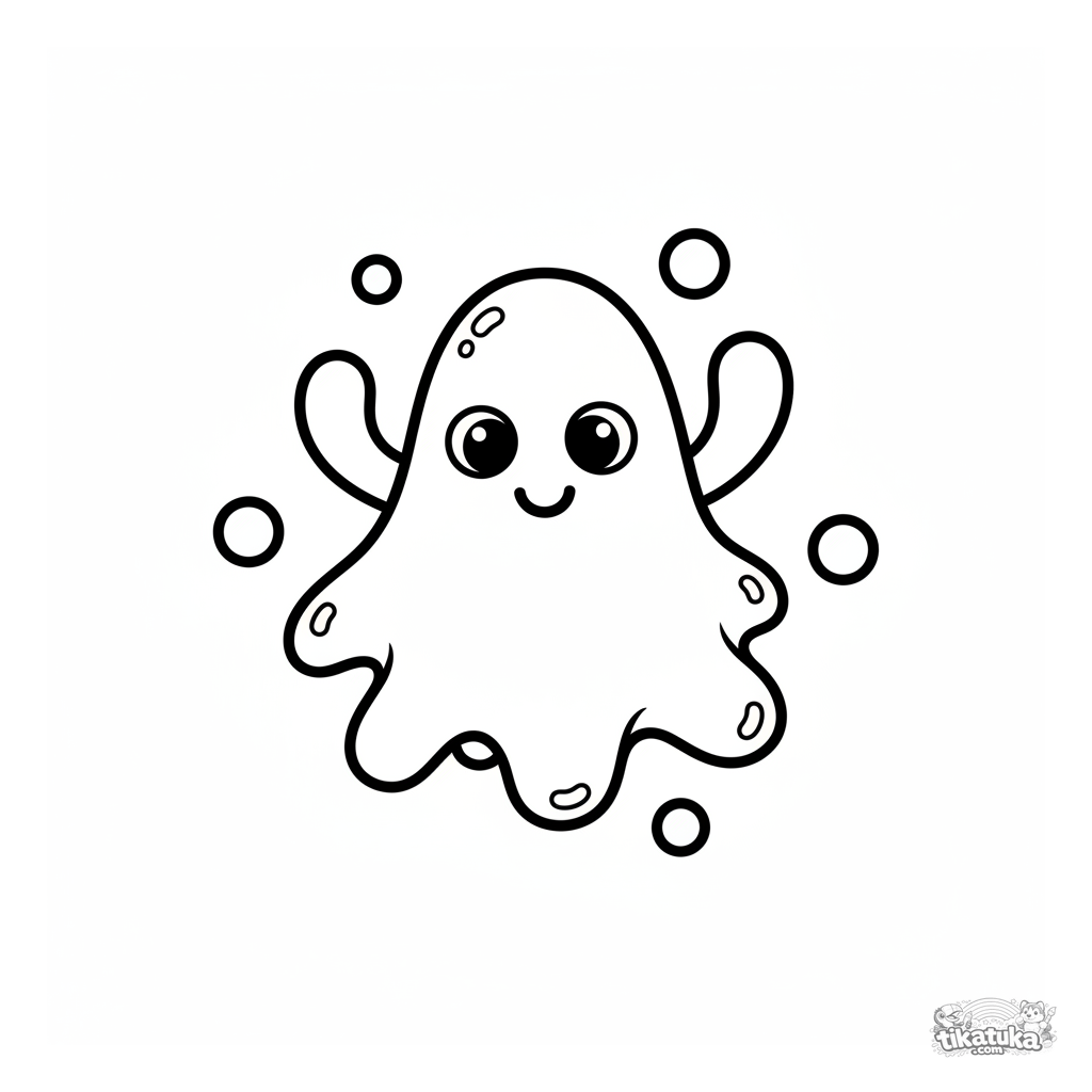 Página para colorear para niños pequeños 2-3 años: una ameba amigable con un ojo grande y una sonrisa saluda con sus seudópodos. Forma muy simple, contornos gruesos.