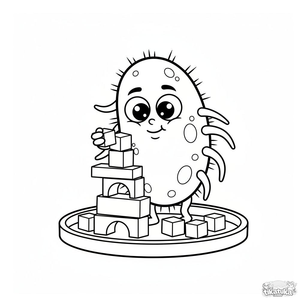 Página para colorear simple para niños pequeños de 2 a 3 años. Un microbio amigable con ojos grandes construye una torre de bloques en una placa de Petri. Formas grandes, pocos detalles.