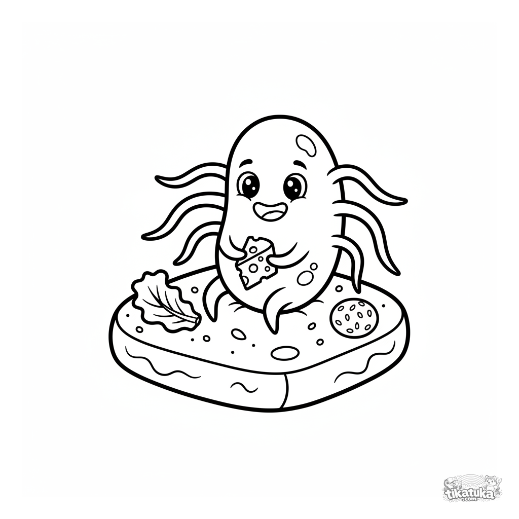 Página para colorear para niños pequeños 2-3: una bacteria amigable con flagelos haciendo un picnic en una miga de pan. Formas muy simples y grandes, pocas líneas.