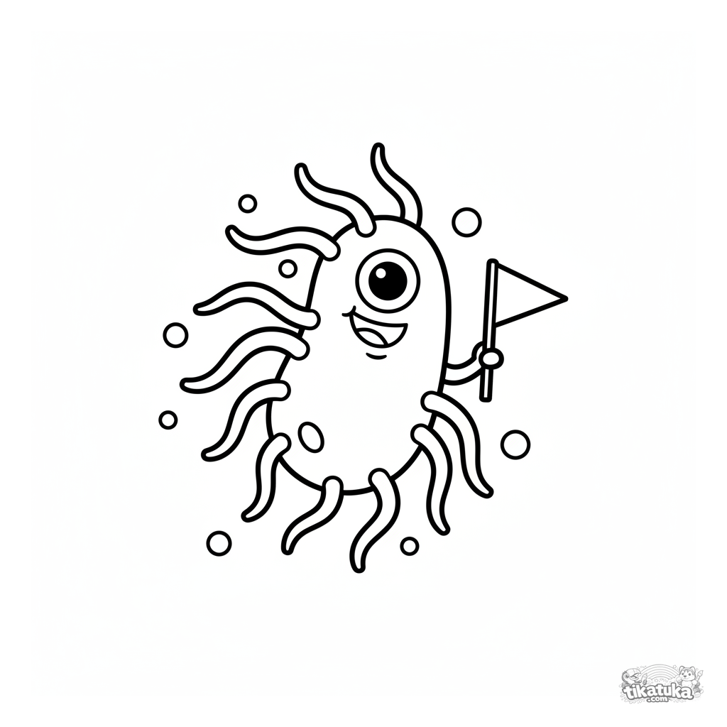 Página para colorear fácil para niños pequeños de 2-5 años: una bacteria feliz con flagelos sosteniendo una bandera. Imagen linda y simple.