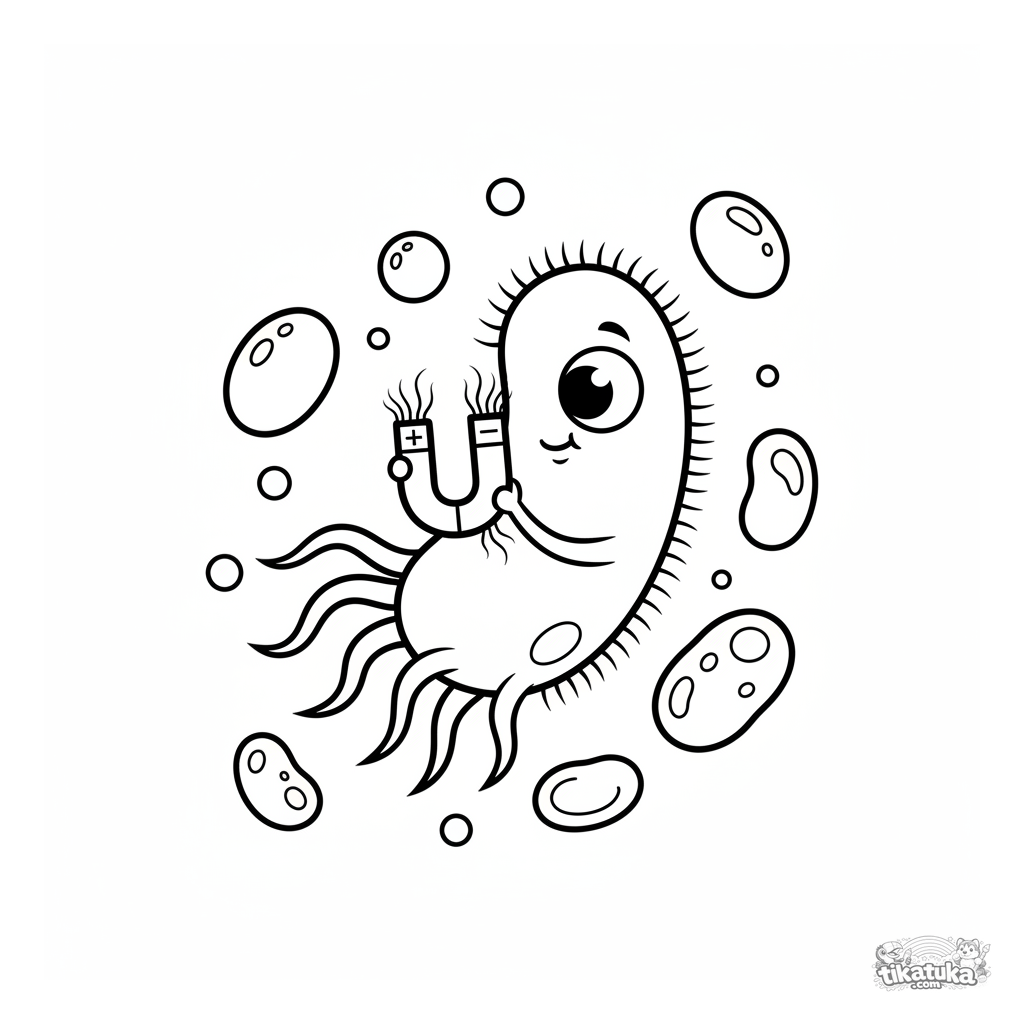 Páginas para colorear de microbios lindos para niños. Para niños de 3 a 6 años. Una bacteria con flagelos examina un imán pequeño.