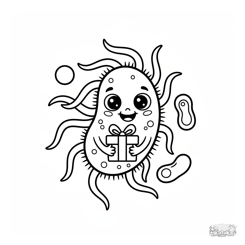 Una bacteria tierna de dibujos animados con flagelos sostiene un pequeño regalo. Página simple para colorear para niños pequeños de 2 a 5 años.