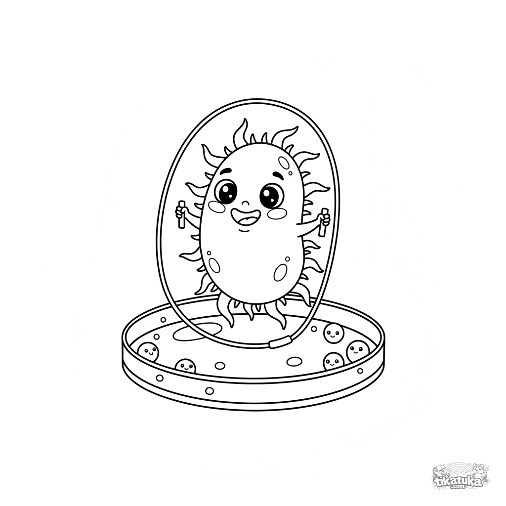 Página para colorear de microbios para niños de 4-6 años: una bacteria amigable juega a la cuerda dentro de una placa de petri. Escena de dibujos animados divertida y educativa.