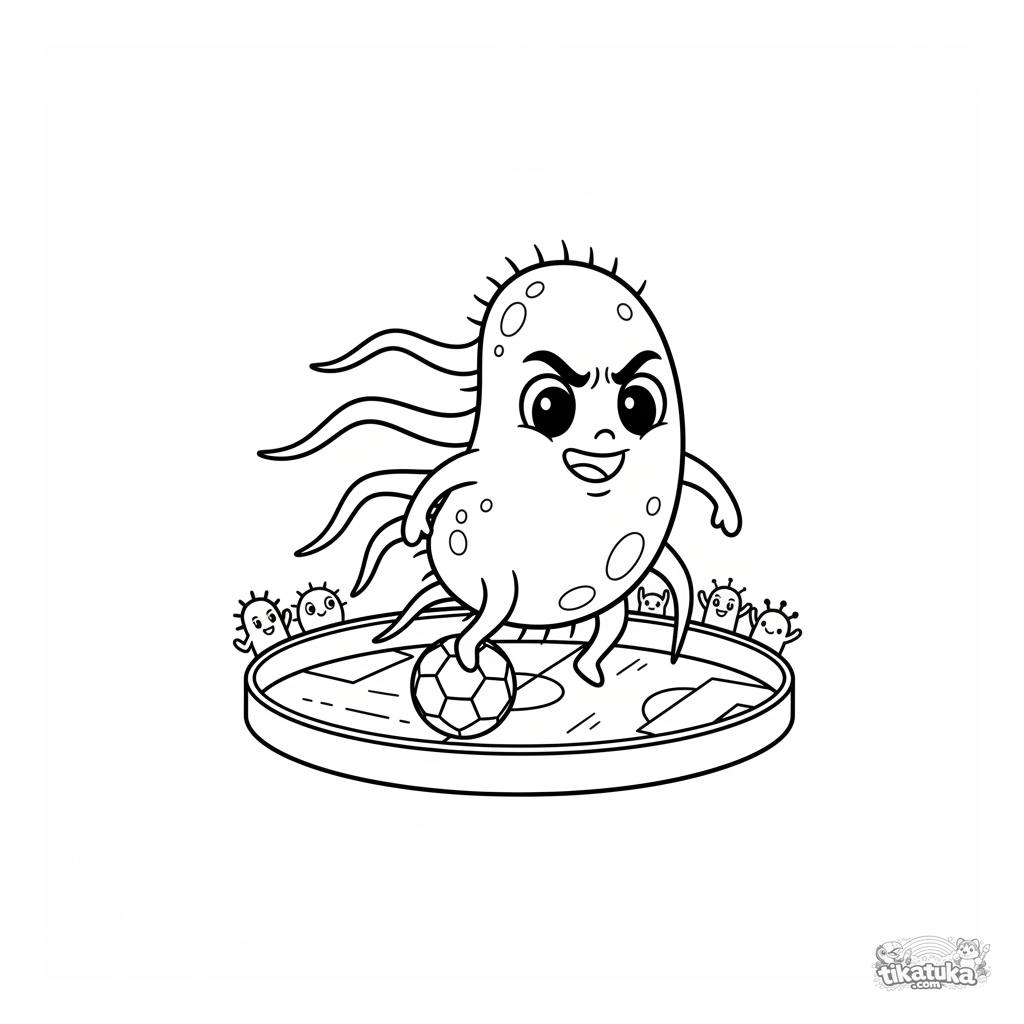 Página para colorear divertida para niños de 4 a 6 años: una bacteria amigable con flagelos juega al fútbol en una placa de Petri. Escena linda y educativa.