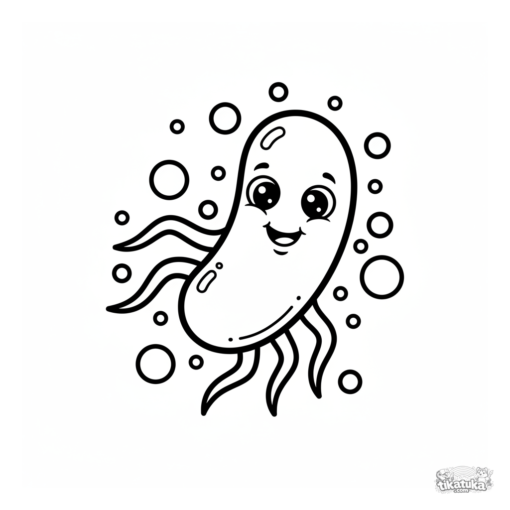 Página simple para colorear para niños pequeños de 2-3 años: una bacteria feliz con una sonrisa nada entre partículas diminutas. Grandes contornos claros son perfectos para los primeros crayones.