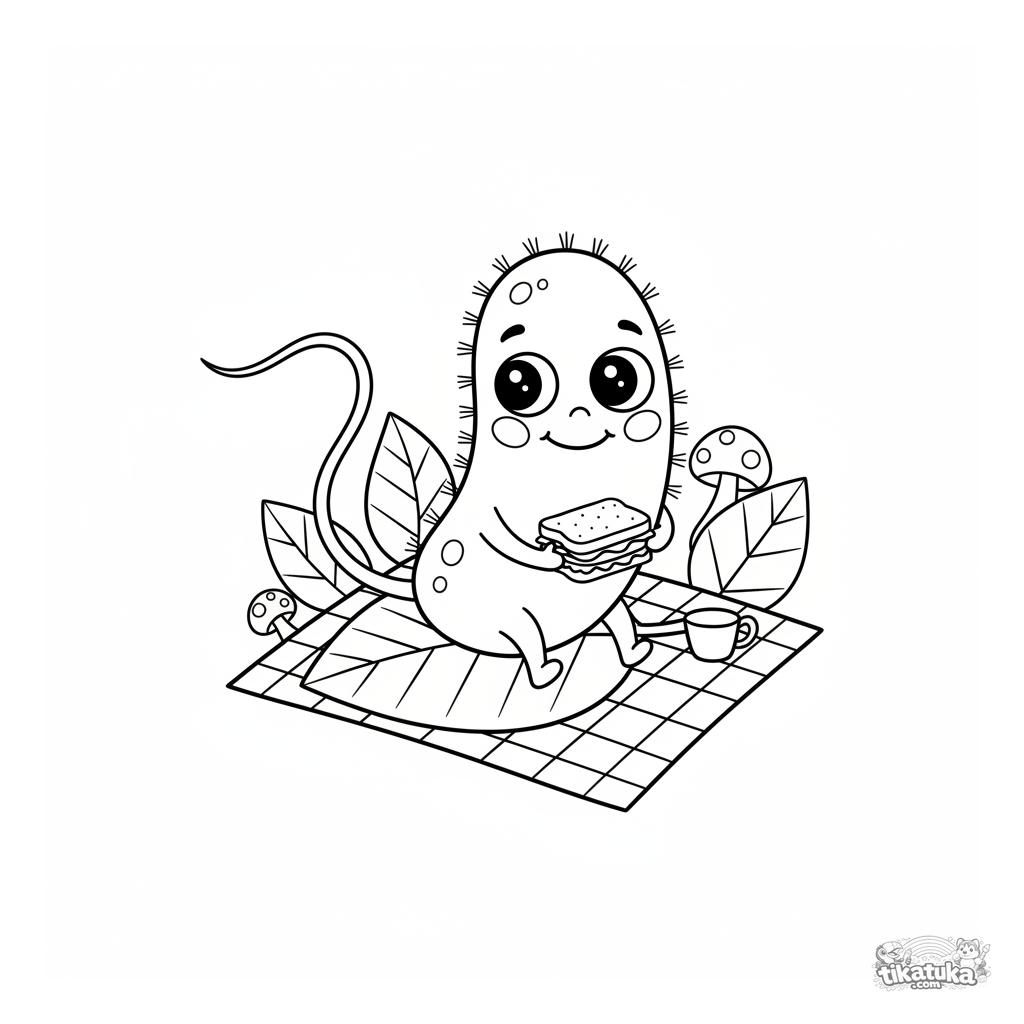 Página para colorear de una bacteria linda haciendo un picnic en una hoja. Para niños de 4 a 6 años. Un microbio divertido con un sándwich.