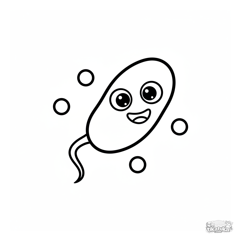 Página para colorear muy simple para niños pequeños 2-3 años: una bacteria tierna con ojos grandes nada con su flagelo. Formas grandes y claras.