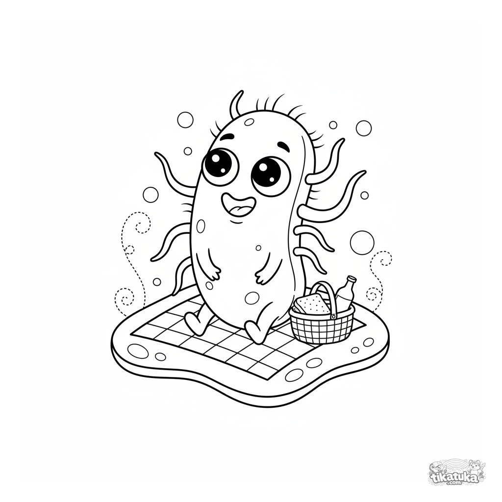 Página para colorear divertida para niños de 4-6 años: una bacteria amigable haciendo un picnic. Personaje de dibujos animados para explorar microbios.