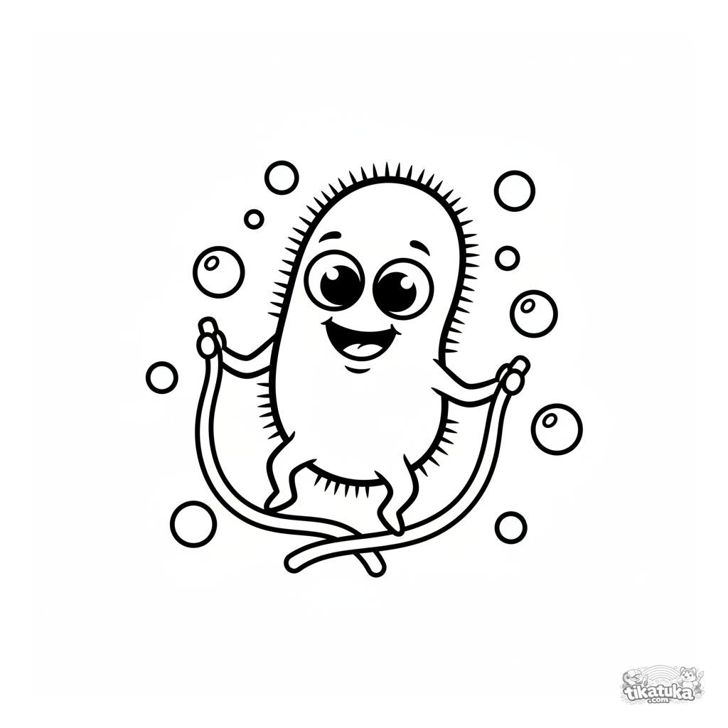 Página para colorear para niños pequeños: una bacteria linda y amigable con ojos saltones juega a la cuerda. Formas y contornos muy simples para 2-3 años.