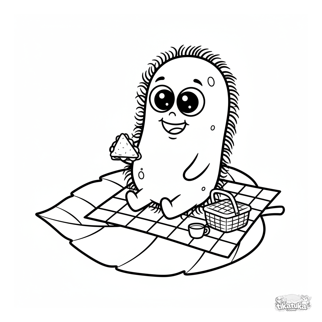 Página para colorear de una bacteria de dibujos animados teniendo un picnic en una hoja. Escena simple y divertida para niños pequeños de 2-5 años.