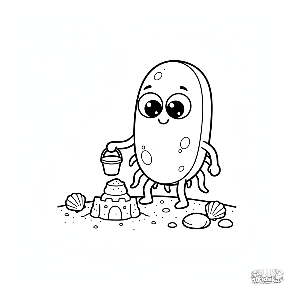 Página simple para colorear para niños pequeños 2-3 años: una bacteria amigable construye un castillo de arena. Formas grandes y simples, sin fondo.