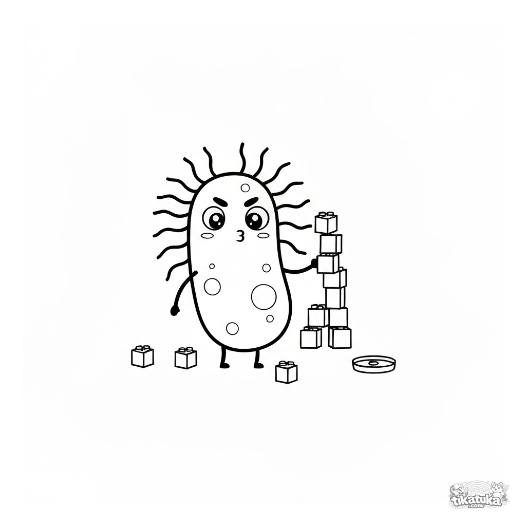 Página para colorear simple de una bacteria de dibujos animados construyendo una torre de bloques. Para niños pequeños de 2 a 5 años.
