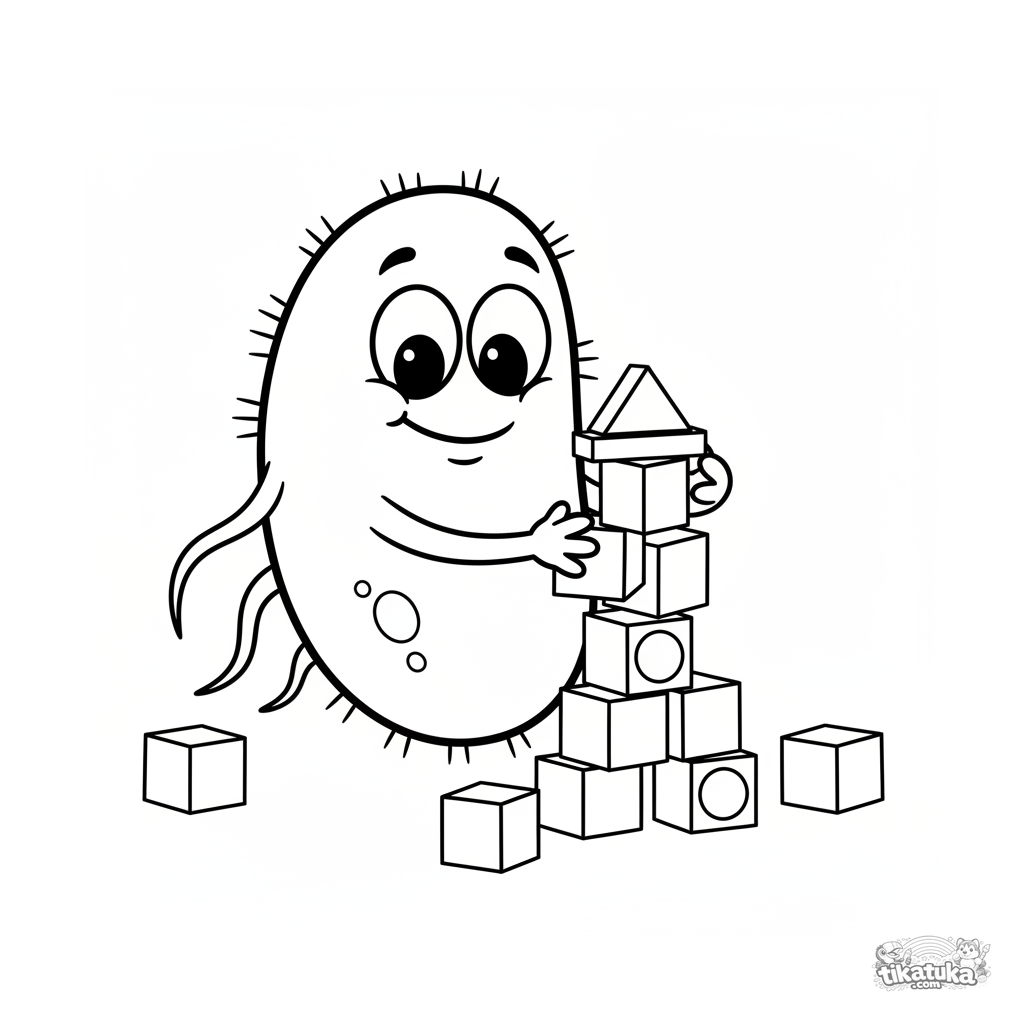 Página de microbios para colorear: una bacteria linda con ojos saltones construye una torre de bloques de proteína de colores. Para niños pequeños de 2 a 5 años.