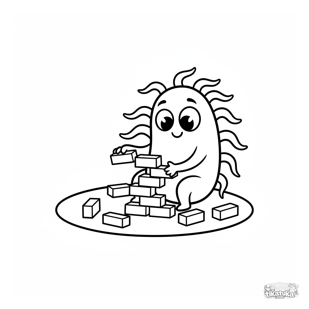 Página simple y linda para colorear de una bacteria amigable construyendo una torre. Para niños pequeños de 2 a 5 años.