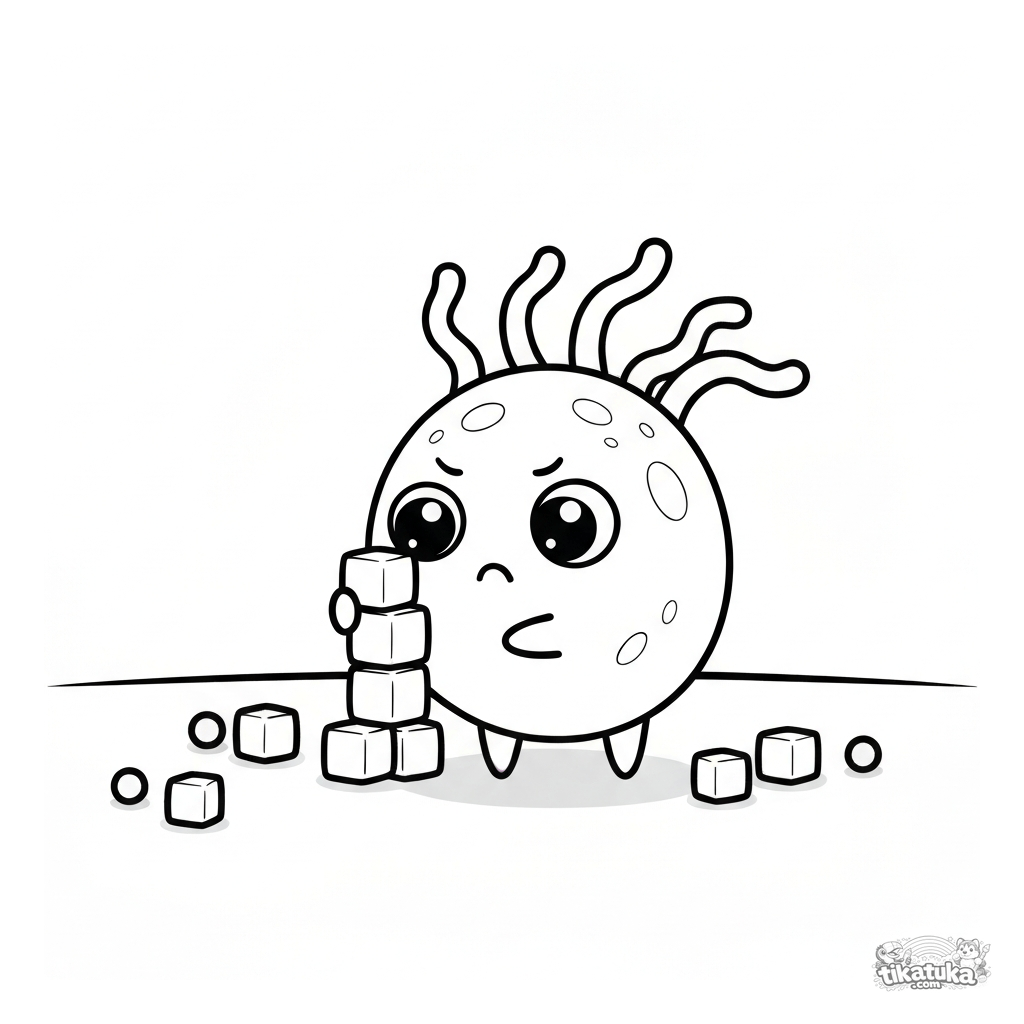 Página para colorear de una bacteria graciosa construyendo una torre con bloques de moléculas. Para niños pequeños de 2-5 años. Escena simple y linda con ojos grandes y flagelos.