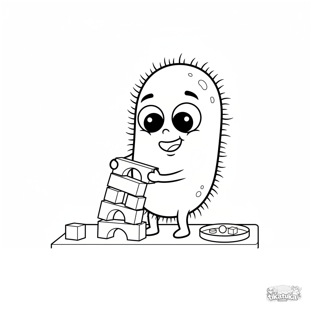 Página simple y divertida para colorear de una bacteria amigable construyendo una torre de bloques. Para niños pequeños de 2 a 5 años. Microbio con ojos grandes en un portaobjetos.