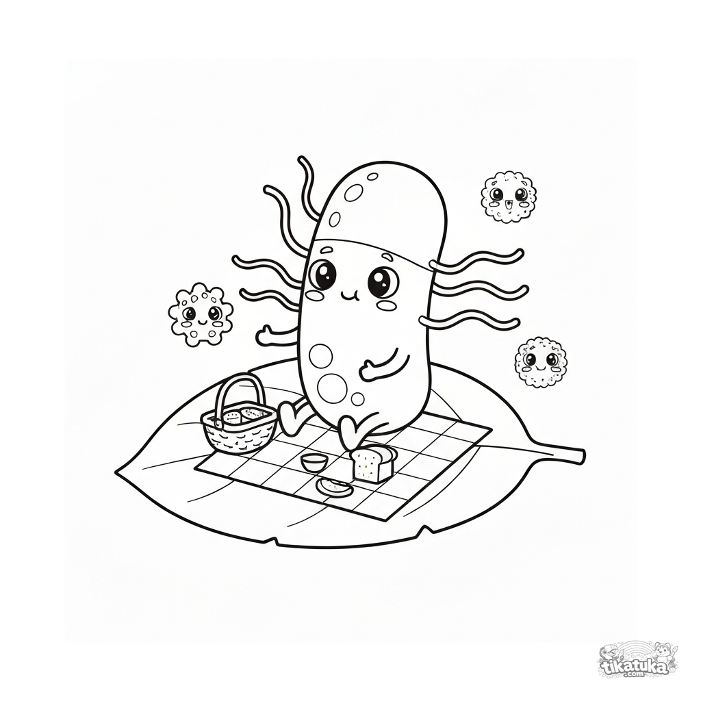 Página para colorear divertida de una bacteria amigable de picnic en una hoja. Para niños pequeños de 2 a 5 años. Escena simple.