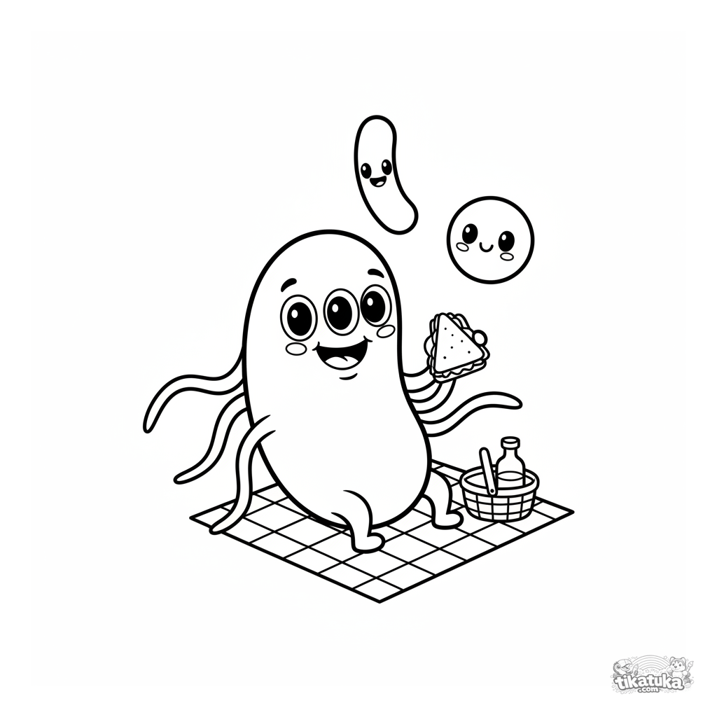 Página para colorear fácil con una bacteria de dibujos animados teniendo un picnic. Para niños pequeños de 2 a 5 años. La bacteria tiene múltiples ojos y flagelos, con una cesta y amigos microbianos cerca.
