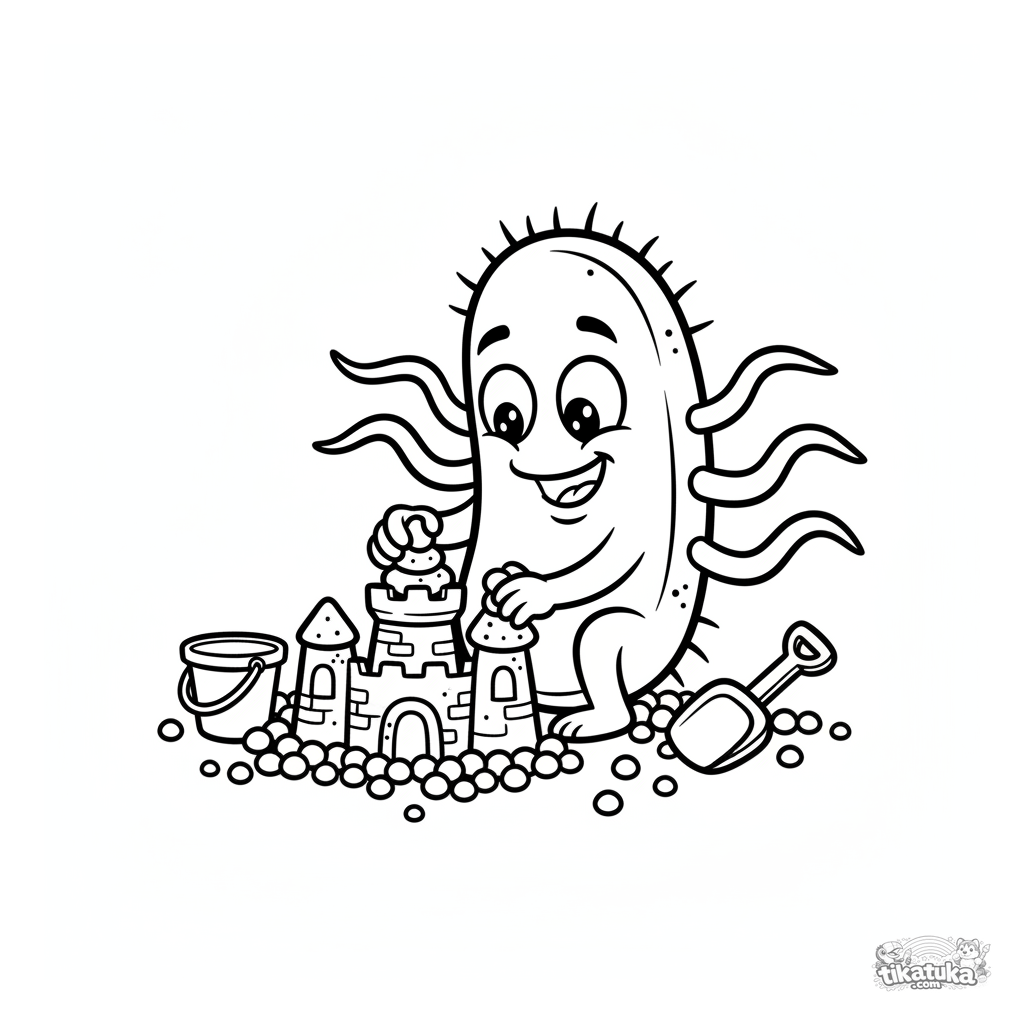 Página para colorear fácil y linda para niños pequeños de 2 a 5 años: una bacteria amigable con múltiples ojos construye un pequeño castillo de arena con cubo y pala.