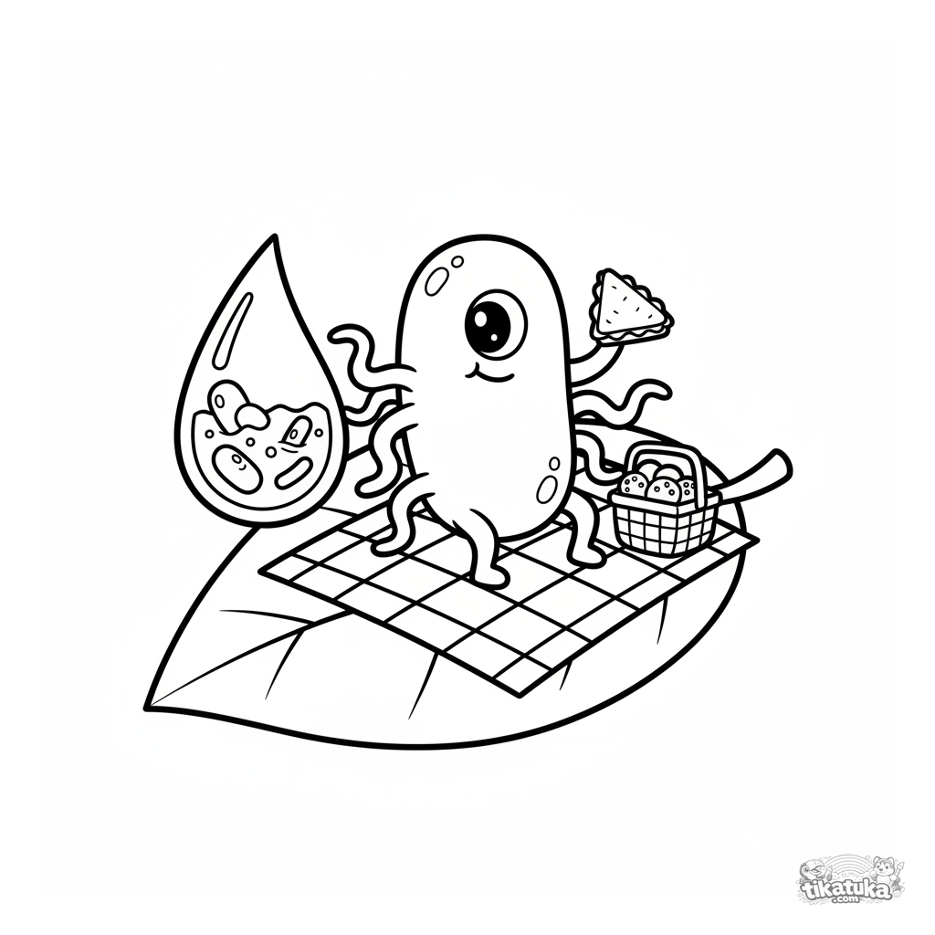 Página para colorear divertida de una bacteria para niños pequeños (2-5 años). La bacteria amigable hace un picnic en una hoja grande.
