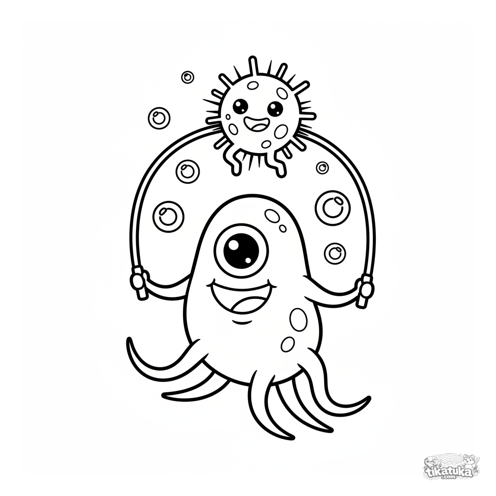Página para colorear de bacterias de dibujos animados jugando alegremente a la cuerda. Para los más pequeños, de 3 a 5 años.