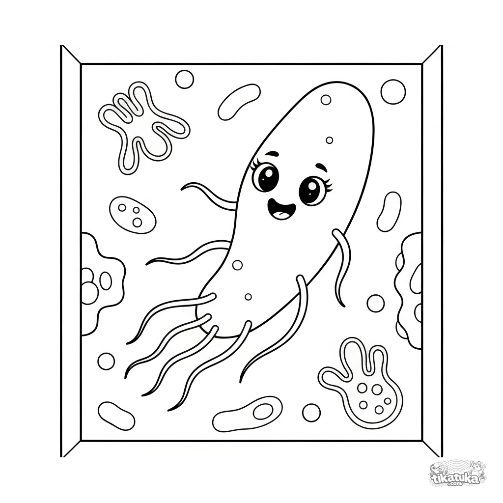 Página para colorear de una bacteria linda nadando con sus flagelos. Para niños de 5 a 8 años.