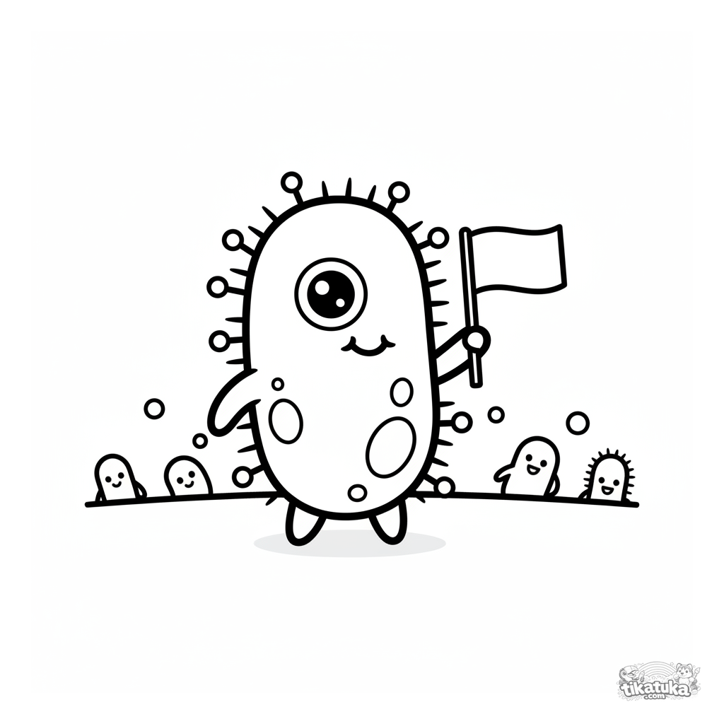 Página para colorear simple de una bacteria tierna y amigable agitando una banderita. Para niños pequeños de 2 a 5 años.