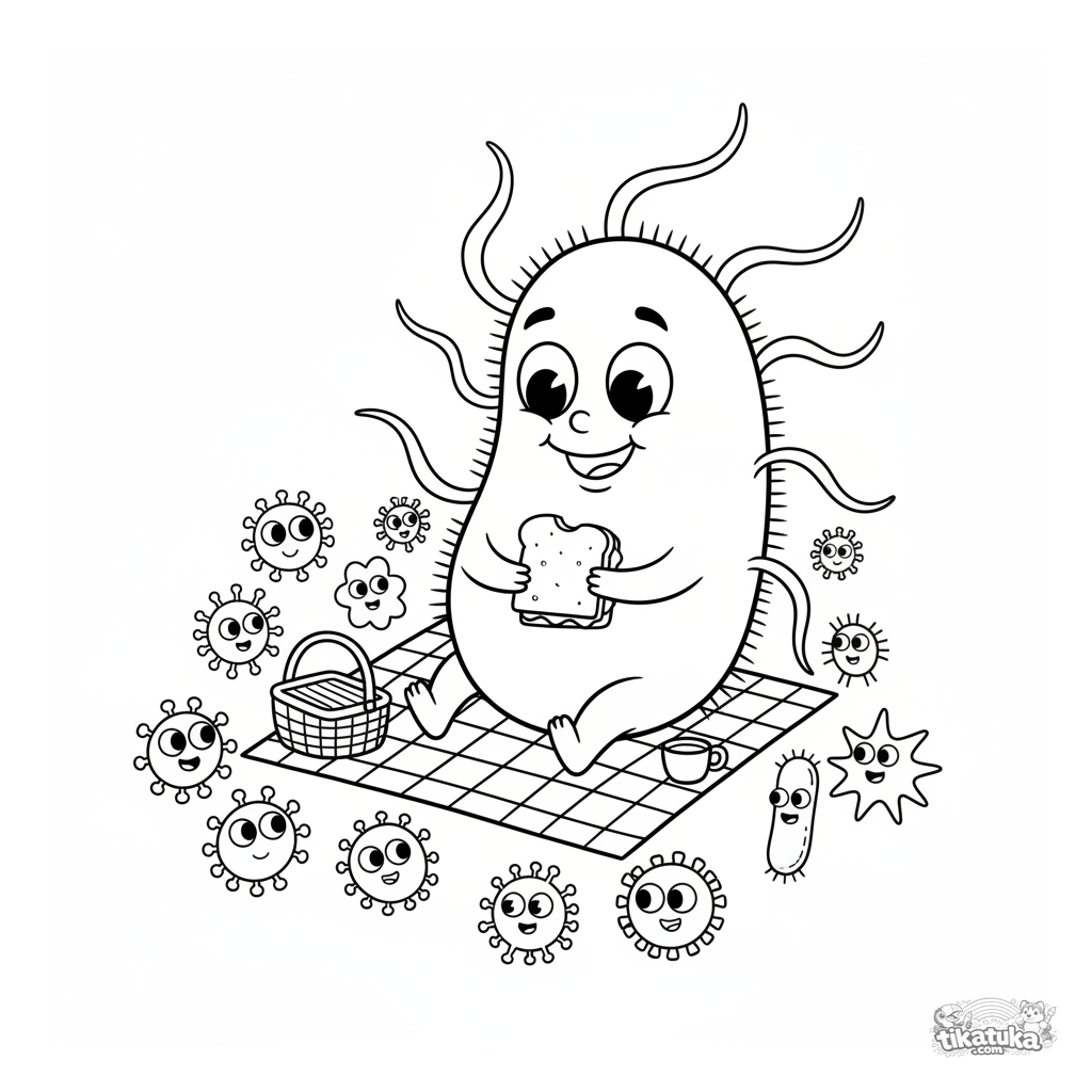 Divertida página para colorear de una bacteria amigable en un picnic. Para niños de 5 a 8 años.