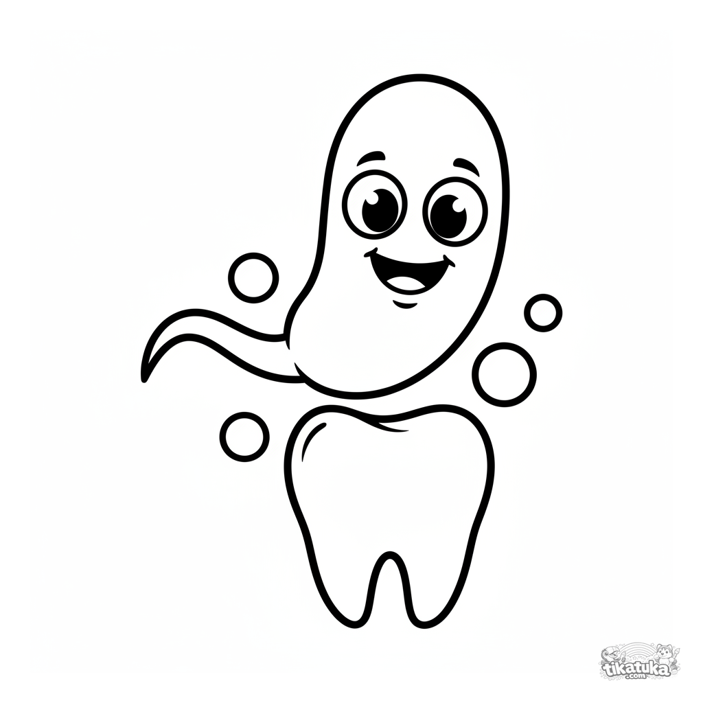 Página simple para colorear para niños pequeños 2-3: una bacteria de dibujos animados feliz con ojos grandes nada cerca de un diente.