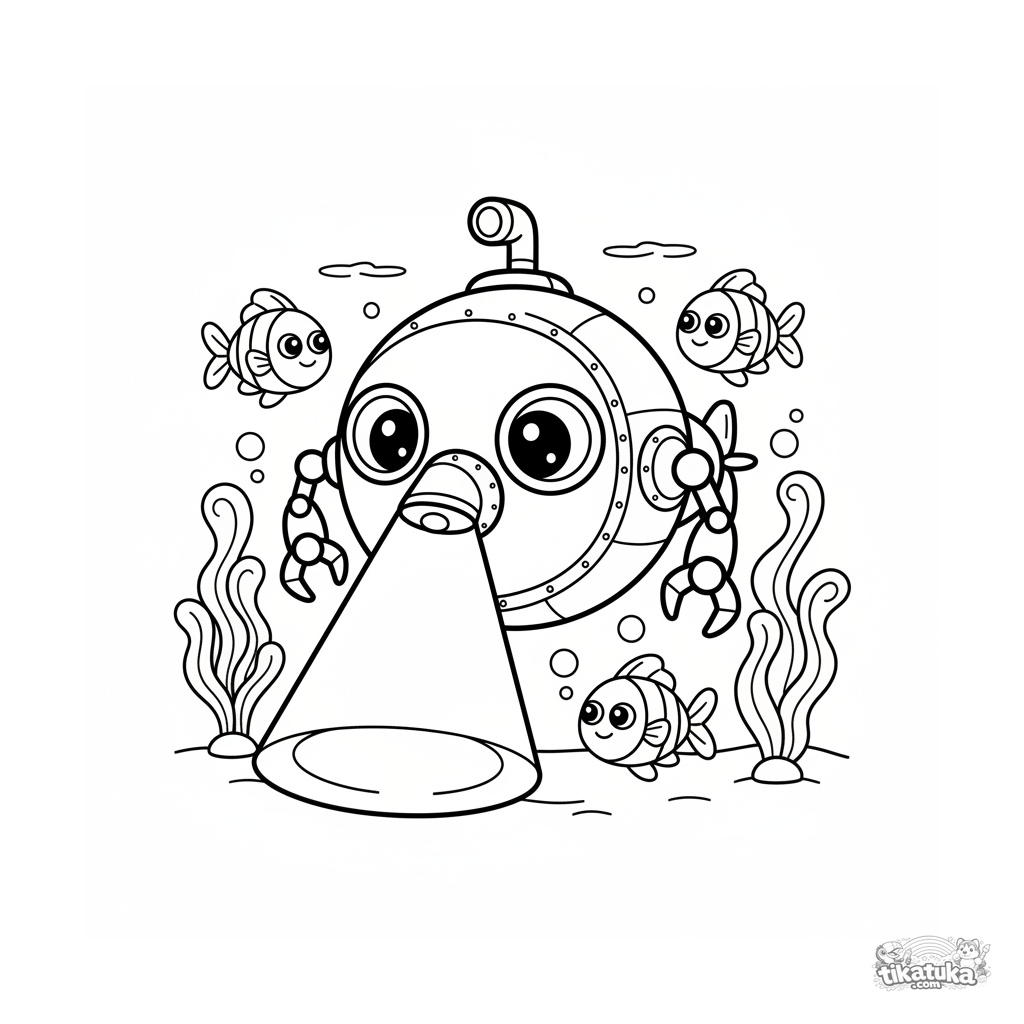 Página muy simple para colorear para niños pequeños de 2-3 años: un lindo submarino redondo con ojos-ventana explora el mar profundo. Formas grandes.