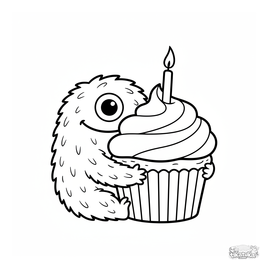Página para colorear para niños pequeños de 2-3 años: un monstruo peludo y amigable con un ojo abraza un cupcake grande. Formas extremadamente simples y grandes.